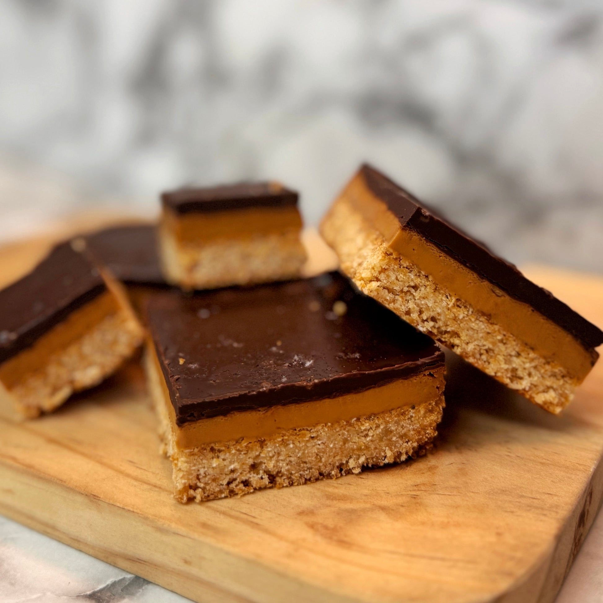 •Barritas de galleta con capas de caramelo salado y chocolate